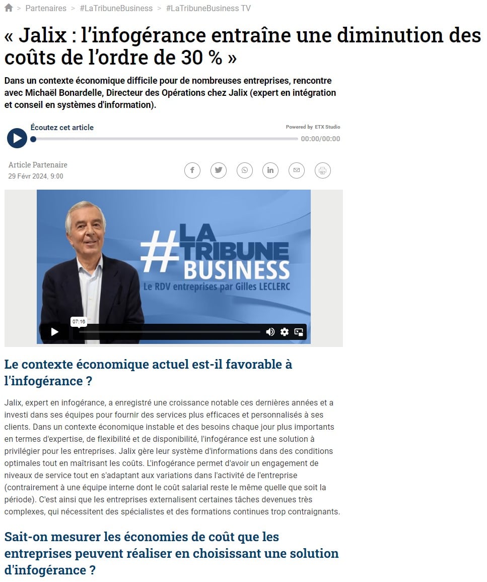Nous sommes heureux de vous partager l’intervention de Michaël BONARDELLE sur « La Tribune Business » pour parler de Jalix , mais revenons sur ce programme…
