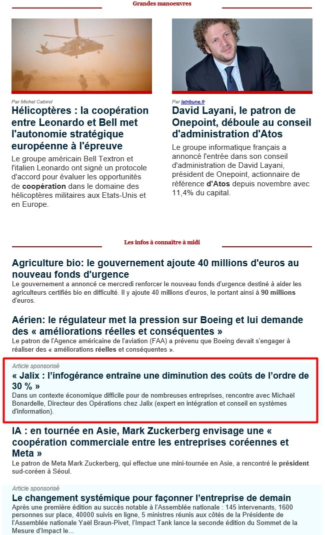 Newsletter « La Tribune » avec une mise en avant de Jalix :